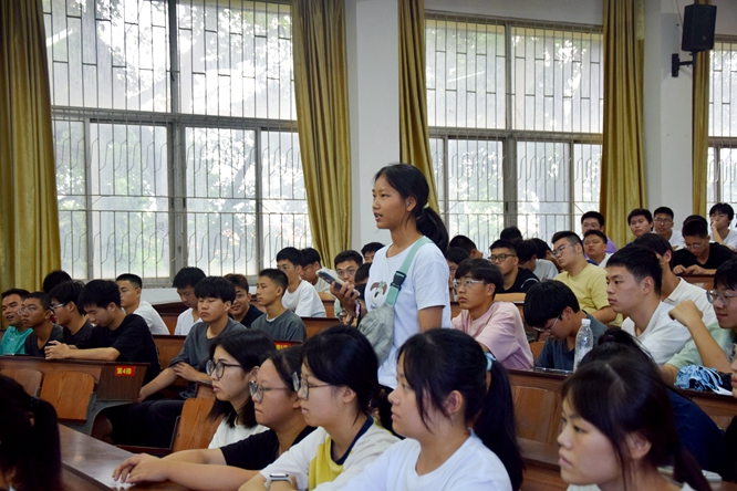 讲座中,卢丽敏围绕“漫话化学魔力”、“简述专业特色”及“浅谈大学能力培养”三个方面,详细介绍了应用化学专业及化学学科的发展历程,着重展示了学院、专业的师资力量和人才培养成果,并希望全体新生要学会具备适应环境的能力、自学的能力、语言表达的能力、独立自主的能力和识人交友的能力。刘书武细致阐述了材料化学作为一门交叉学科所具备的实用性和前沿性,并建议学生在大学期间要学会学习和为人处世,经常性参加实践活动和体育锻炼,树立远大目标。