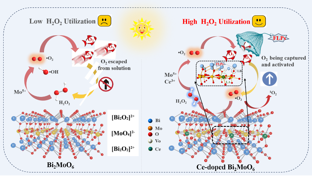 为了解决这一问题,本文以Bi2MoO6为模型催化剂,通过掺杂杂原子Ce,形成丰富的受阻路易斯酸碱对位点,诱导电子转移至缺陷能级并加强反应过程中逸出氧的吸附与活化,产生更多超氧自由基,实现对H2O2的高效利用。以四环素为目标污染物,研究了Ce-Bi2MoO6光芬顿降解多菌灵的性能,探究了不同的pH值、H2O2浓度、不同气体氛围对四环素降解效率的影响,并通过H2O2浓度测定实验、曝气实验与EPR等表征手段进行分析其逸出O2再利用机制,并阐释了其光芬顿降解四环素的反应机理。