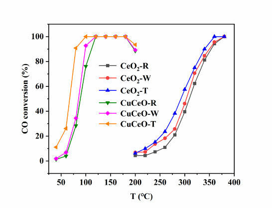 一维纳米CeO2具有独特的界面效应,为探究一维CeO2形貌与CuO/CeO2活性的关系,该论文采用水热法合成了一维纳米CeO2 (棒状、线状和管状),并以其为载体制备了CuO/CeO2催化剂用于CO-PROX反应,结果表明具有管状形貌的CuO/CeO2催化剂具有最强的低温活性。