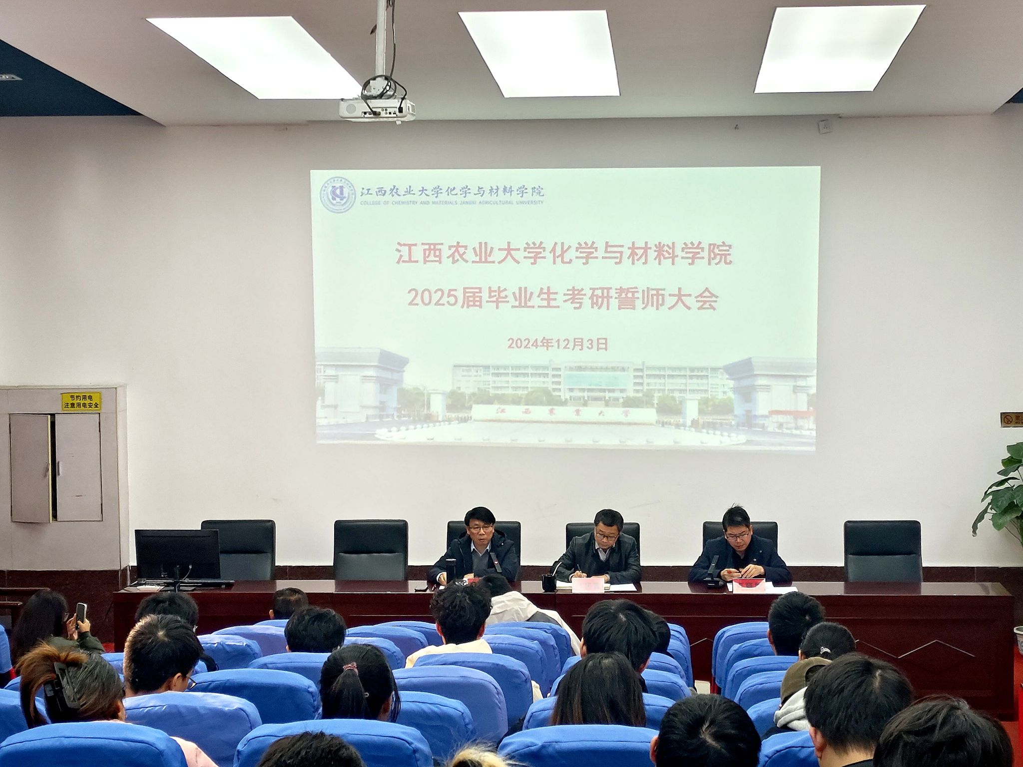 考研学生代表、应化2101班何晶晶在发言中分享了复习备考的心路历程,并代表全体学生感恩学校与学院的培养。考研学生代表、材料2101班李翔带领全体考研学子进行宣誓,以铿锵有力的誓言展示了全体学子必胜的信念。毕业班班主任先后向大家送上美好祝愿。