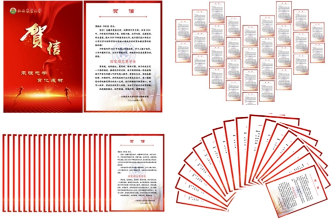 学院高度重视本次活动,精心撰写学生表现、未来展望和新春祝福等贺信内容,共寄出贺信46封,每一封贺信都承载着学院对学子胸怀理想、潜心治学、勤勉笃行的肯定,是学子荣誉的象征、成长的见证、努力的回报,进一步健全了家校沟通平台,增进家校育人共识,凝聚家校育人合力。“学院的贺信让我备受鼓舞,我要坚定理想信念,接续创造新的业绩,成为可堪大任的社会主义建设者和接班人。”保研至四川大学的材料2101班胡文涛说道。应化2304班任艺家长表示,荣誉不仅是孩子努力的结果,更离不开学校学院全体老师悉心教育和培养,将继续加强与学校的联动,共同为孩子成长保驾护航。