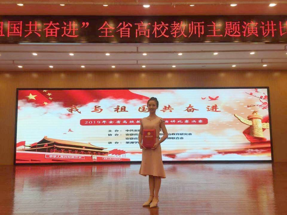 作为一名来自红色老区的土家族党员,唐老师始终坚持爱国主义教育,把培育和践行社会主义核心价值观融入校园文化建设中。在课堂上,她把红色歌曲作为授课重点,通过剖析歌曲背后的故事,宣扬老一辈无产阶级革命家的革命事迹和牺牲精神,激发学生的爱国热情。同时,积极参加各类演讲比赛,结合自身经历,讴歌新中国成立以来特别是改革开放四十周年来取得的举世瞩目的成就,担当爱国主义的“弘扬者”。在安徽省科教文卫体系统职工庆祝改革开放四十周年演讲比赛、安徽省高校教师“我与改革开放共成长”主题演讲比赛中,她从不同的角度、通过不同的事迹向大家讲述了家乡——湖北省恩施土家族苗族自治州翻天覆地的变化,用亲身经历感恩改革开放的丰功伟绩,激发了大家的共鸣,分获一等奖和二等奖;在全省高校教师“我与祖国共奋进”主题演讲比赛中,她把爱满天下作为自身矢志不渝的中国梦,深深打动了评委老师,再次获得了一等奖。既为学校争得了荣誉,也让更多的人受到了爱国主义教育。
