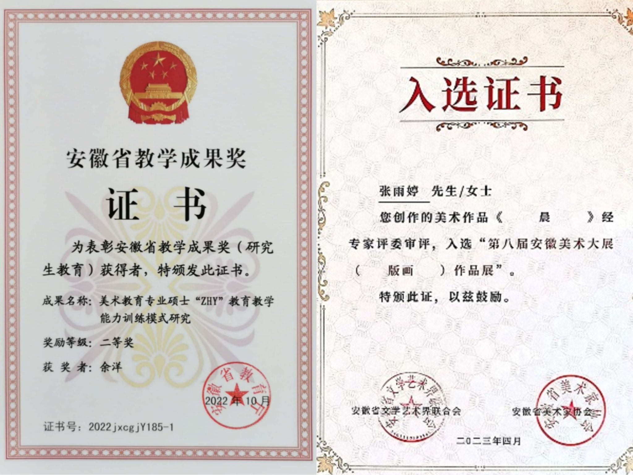 四十年来,美术学专业立足区域发展需要,致力于应用型人才培养,将美术技能与美术教学技能融通,实施“双师”教学,聚焦“三笔三能”理念,培养课堂教学能力、专业技术能力和教学研究能力。以产出为导向,培养“教育理论新、学科知识新、教学技能新”,善于教学,能美术创作,会学生管理的新时代美术教师。近五年,学生获得第十届“挑战杯”安徽省大学生创业计划竞赛金奖、长三角地区美术师范生教学技能大赛一等奖、全国首届美术学科大中小一体化课程思政大赛二等奖、安徽省高等学校师范生教学技能竞赛二等奖;获得国家级大学生创新创业训练计划项目5项,省级以上专业赛事获奖100余项。